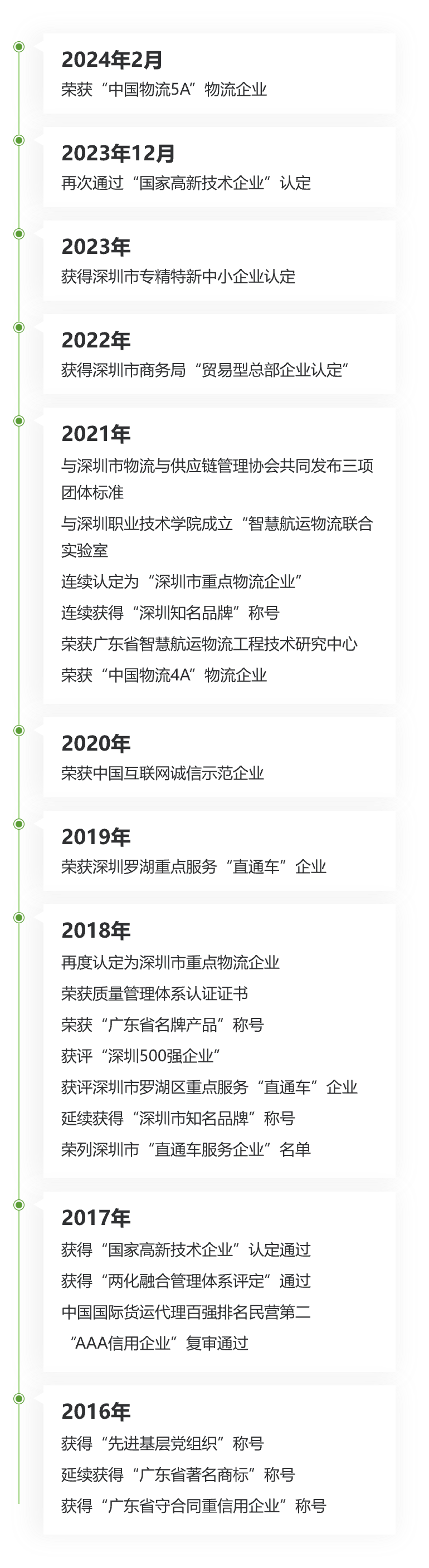公司總部位于深圳,集團(tuán)旗下共有10多家子公司。同時(shí),公司在全國設(shè)有20多家分公司和分支機(jī)構(gòu),擁有遍及全球120余個(gè)國家、300多個(gè)港口的代 權(quán)。2006年以來,公司一直在跨境物流行業(yè)和現(xiàn)代物流服務(wù)業(yè)占有主導(dǎo)地位,獲得了國家高新技術(shù)企業(yè)、國家電子商務(wù)示范企業(yè)、廣東省電子商務(wù)示 范企業(yè)、廣東省智慧航運(yùn)物流工程技術(shù)研究中心、廣東省名牌、廣東省守合同重信用企業(yè)、深圳市重點(diǎn)物流企業(yè)、深圳知名品牌、連續(xù)獲得深圳百強(qiáng)和 500強(qiáng)企業(yè)等多項(xiàng)榮譽(yù),并順利通過ISO9001認(rèn)證、知識產(chǎn)權(quán)管理體系認(rèn)證、中國5A級物流企業(yè)認(rèn)定、深圳市貿(mào)易型總部企業(yè)認(rèn)定等。
